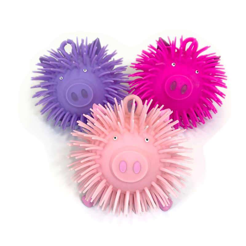 Cute pig puff ball toy that's covered in lots of wobbly strands. This round pig is super squishy and squeezy, but has the added tactile sensation of several long, soft strands all over its body. You can just about see his face and feet poking out from it all. Also features a loop on its back for your finger or a keyring hoop. Supplied in an assortment of colours.