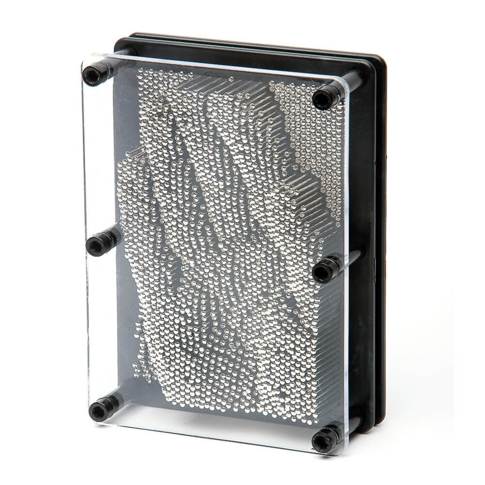 Lift the device to your face - or another appropriate part of your anatomy and gently press down on the thousands of metal pins to reveal a perfect 3D impression behind a Perspex panel.
