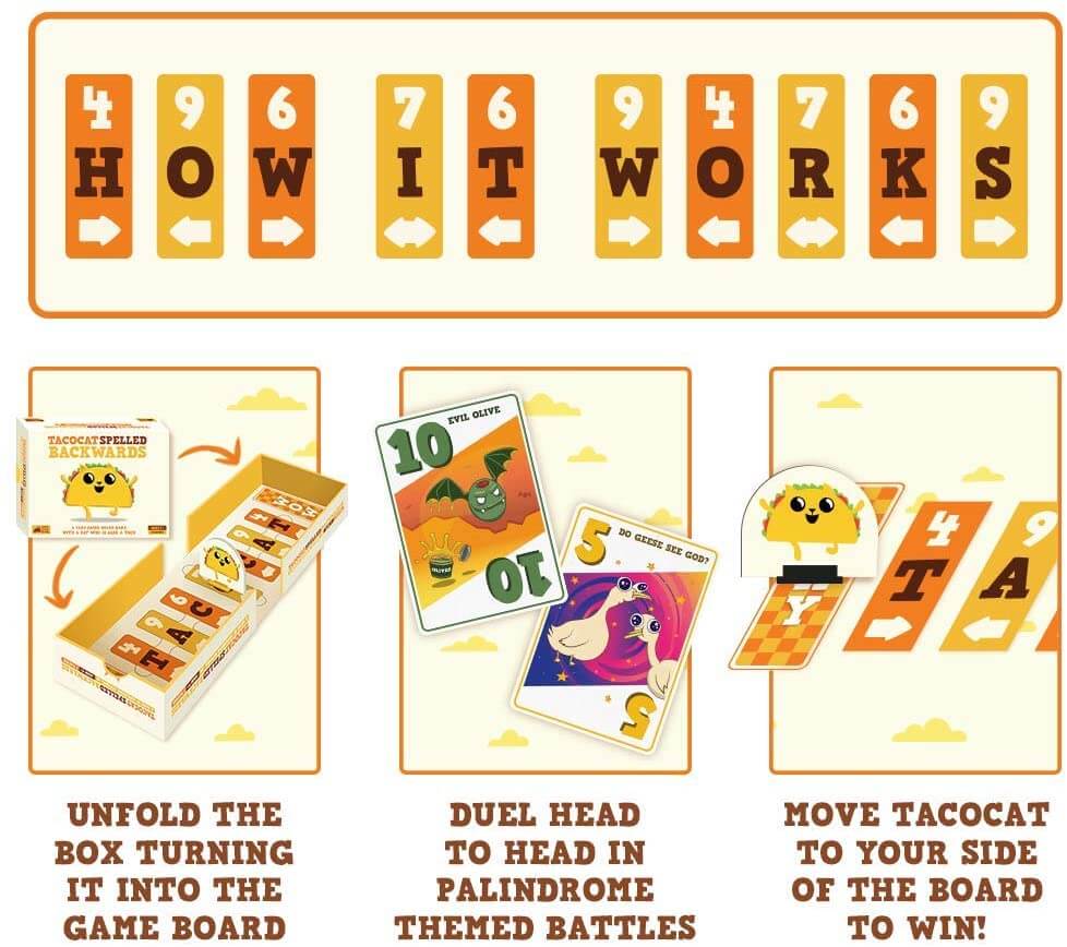 A lil' board game with a cat who is also a taco. With Tacocat on the line, anything can happen in this palindrome-powered tug-of-war! Win duels by playing cards of matching or higher value to defend your hand or sacrifice your lowest card. When you're on your final card, whoever has the lowest value card wins the round bringing Tacocat closer to their side.