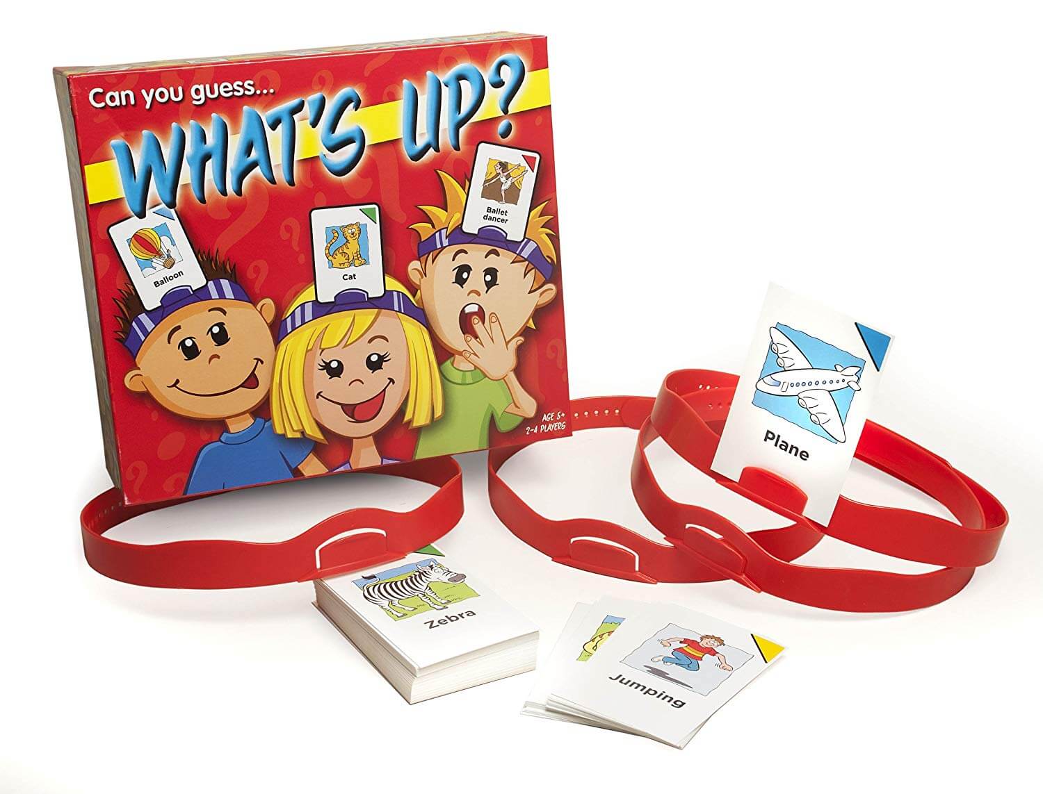 This classic ‘What's on my head?' game is written especially for children to play and enjoy. What's Up will provide hours of hilarious fun for kids of all ages and also encourages them to interact and to use their imaginations. This parlour game has four categories of cards - people, sports, transport and animals. To get started, shuffle the chosen cards and place them face down in the centre. Each player puts a plastic card holder on their head. These are adjustable so they fit heads of different sizes. Then each player takes a card and without looking at it slots it into the plastic card holder on their head. Each card has an image on it, for example a lion, a fire engine or a balloon and then each player has to guess ‘what's on their head' by asking a series of searching questions, where the answer can only be yes or no. As well as being great fun, the game teaches children to consider what question they need to ask in order to help them guess the answer. The cards are graded for younger and older children and so can be played by children of different ages at the same time, making this a prefect party or family game. The player with the most cards correctly identified is the winner.